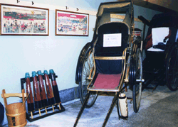 The earth floor ,the Japanese style counter and the long style brazier are in this shop,and the business of the rickshaw is being carried on every day in this shop like a set for the movie. |