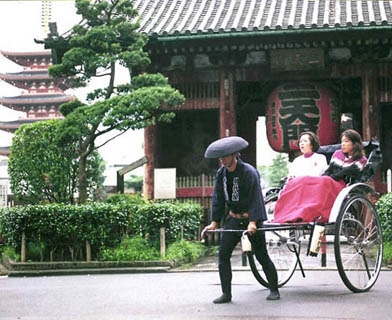 ![]() Romanticism of JIDAIYA The rickshaw runs.Panting on the slope,going through the alley or weaving through the houses. Kicking about the snow,passing under the bloom,sweating under the sunlight,stepping on the fallen leaves or going against the cold wind. The rickshaw runs more slowly than the bicycle,the car or the aircraft. In the times when it takes only a day to go from Hokkaido to Okinawa it somtimes takes an hour or so for the rickshaw to go to the next town. In the times when thousands of people can be carried at a time the rickshaw carries only one or two persons. And we can not run faster than the speed of man's foot. But we like this vehicle which has only the power limited by the man's power. Traveling is becoming like mere movement by shortening the time and the inn is becoming like the lodging by saving troubles. The town changed into the street.The earth disappeared from the road. The alley disappreared.The plain, the vacant land and the copse disappeared. Though we got something which people call the abundance,we can not be satisfied. We think somthing is missing in our lives. JIDAIYA pull the rickshaw. Rickshaw-men run avoiding pebbles,keeping the balance on the slope or softening the shake of the rickshaws. Passengers thank for rickshaw-men's kind consideration looking at aweat on their backs without saying anything. The hearts of the passenger and the rickshaw-man get together. The rickshaw runs taking on the man.The man runs in the times. JIDAIYA run keeping the words "The only chance in our lives" in our minds. |